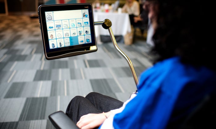 Steve, a software engineer, was diagnosed with ALS (amyotrophic lateral sclerosis, a type of motor neurone disease) aged 50. He knew it was progressive and incurable; that he would soon become unable to move and, in his case, speak. He is using eye-gaze technology to tell me this (and later to turn off the sound of Bonnie Tyler); cameras pick up light reflection from his eye as he scans a screen. Movements of his pupils are translated into movements of a cursor through infrared technology and the cursor chooses letters or symbols. A speech-generating device transforms these written words into spoken ones – and, in turn, sentences and stories form.